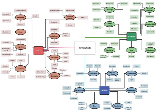 To be able to better describe the characteristics of these general components, we have tried to extend them to include more specific concepts that we have named “elements”. We have adopted a specific approach, based on the “family resemblance” method, as initially described by Ludwig Wittgenstein in his work “Philosophical Investigations” []. According to this philosopher, for instance, the concept of a “game” cannot be defined by one clear-cut definition, but it can be understood as a collection of traits (“elements”) that many games share (i.e., being enjoyable and voluntary). Through this approach, we have, therefore, discarded the idea of a single characteristic, and instead, we have chosen to define each component as a set of overlapping aspects. This approach appeared particularly suited to our case, also emerging from the comments left by the users of the Cultural Probe Kits, who reported across different stories “common elements”, much like “family members” who shared certain traits but were never the same. This approach has helped us to introduce a layered and multifaceted definition of authenticity, with its complex interplay of components and elements. Following this method, we have not provided a complete list of all possible elements but only a limited number in line with our specific goal, which is to define a practical guide for designers and evaluators, and in line with our application context (digital heritage). Moreover, we also want our “elements” to be used to evaluate the components qualitatively or/and quantitatively (i.e., through psychophysics and psychometrics tests) and therefore suggest a possible assessment methodology of perceived authenticity in hybrid and XR experiences.