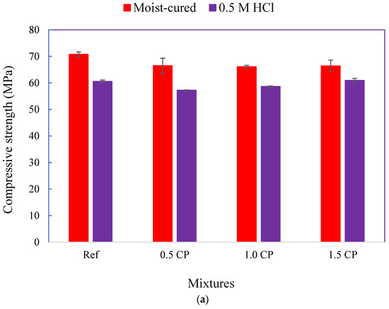 Variations in the compressive strengths of specimens exposed to moist curing and the HCl test solution for 28 days are highlighted in Figure 9a. While the average 28-day moist-cured compressive strengths of mortar mixtures were 71.0 MPa for the Ref and 66.5 MPa for the CP-modified mixtures, the residual strength of all specimens after acid exposure ranged from 57.4 to 60.9 MPa. Relative to the moist-cured specimens, Figure 9b shows that the reduction in the compressive strength of the acid-attacked specimen was 14.4% for the Ref mortar, 13.9% for the 0.5 CP mortar, 11.2% for the 1.0 CP mortar, and 8.2% for the 1.5 CP mortar. Some of the inferences drawn from these results are as follows: First, acid attack-induced strength loss was generally small for all the mixtures. This is partly traced to the limited surface area-to-volume ratio of the 50 mm3 test cubes. Hence, relative to the standard prisms typically used for mortar durability studies, the specimen surface area subjected to acid attack was lower. Moreover, the continued hydration of specimens and the associated microstructure development, while immersed in the acid solution, may have also contributed to the reduced deterioration. Nonetheless, the data in Figure 9a,b suggest that the addition of 1.0–1.5% CP to mortar could potentially enhance its acid attack resistance.
