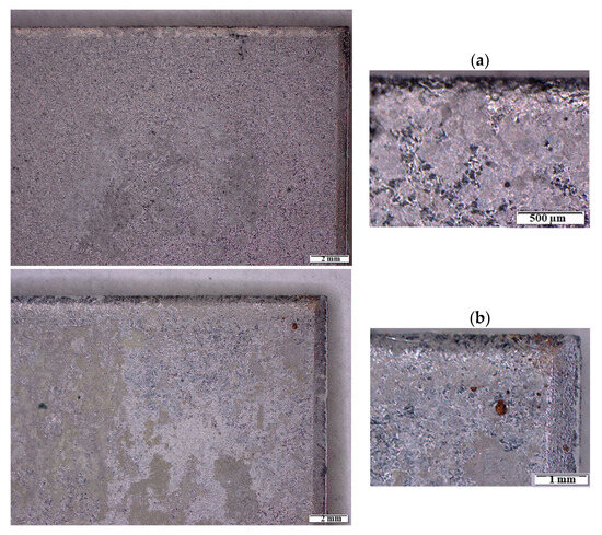 Figure 11 shows bifocal microscope images of the carbon steel sheets after their extraction from the pastes after 14 months of interaction. The steels presented small fragments of pastes on their surfaces, but only small deposits of corrosion products were observed in some areas of the steel embedded in the BFS-C-L paste (as shown in the higher-resolution image in Figure 11b), as corroborated by the Raman spectroscopy results.