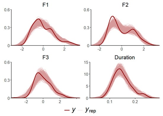 Bayesian regression models were employed for data analysis using the brms package [] in R []. Bayesian models were favored over conventional frequentist approaches because of their capability to handle small sample sizes [,]. F1, F2, F3 and duration were the dependent variables, including the extracted normalized values (expect duration) from speech outputs. Vowel (i, e, a, o, u) (reference level: a) and group (heritage, monolingual) (reference level: heritage) served as fixed factors, while participant served as a random factor. Another notable advantage of Bayesian statistics lies in its ability to incorporate prior knowledge gleaned from previous research. This pre-existing information is integrated into the models using prior distributions. Due to the exploratory nature of this study and the absence of preconceived assumptions about the behavior of data parameters, weakly informative priors were employed. These priors were specified as a Student’s t-distribution with 3 degrees of freedom, a mean of 0, and a standard deviation of 2.5 [,,]; Figure 2 shows the density of the selected priors. After fitting the model with these priors, posterior predictive checks were used to evaluate the fit of the models to the observed data. As seen in Figure 3, the analyses demonstrated that the replicated data (yrep) closely resembled the observed data (y) in terms of their distribution, patterns, and variability, suggesting that all models provided good fits to the data. To assess the probability of the test hypotheses relative to their alternatives, we utilized the evidence ratio (ER) as a quantified measure. An ER of >10 is deemed strong evidence in favor of a hypothesis, while an ER of <0.1 is considered strong evidence against a hypothesis []. For those familiar with frequentist statistics, an ER < 19 is approximately equivalent to α = 0.05 []. We also mention the posterior probabilities (PP).