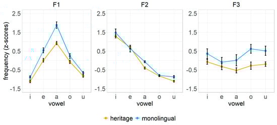 The target words spoken by the speakers were extracted and processed in Praat [] (for similar descriptions, see [,]). Spectrograms and waveforms were visually examined to identify key acoustic features, enabling the measurement of vowel boundaries, including formant frequencies and vocalic duration. To generate these analyses, we employed the following specific settings: a 0.025 positive window length, a 50 Hz pre-emphasis, and a spectrogram view range up to 5500 Hz. Frequencies were measured starting from the end of the noise of the preceding fricative consonant /f/ and the onset of the vowel (V) and concluding at the end of the vocalic periodicity and the onset of the second consonant /f/. Frequencies were measured at their midpoint, a position within the vowel segment where they were least influenced by adjacent sounds. Vowel durations were manually labeled by the first author, involving the determination of each vowel token’s start and end points. F1, F2, F3, and duration values were normalized using the z-score method due to their broad distribution across a wide range of values for all speakers [].