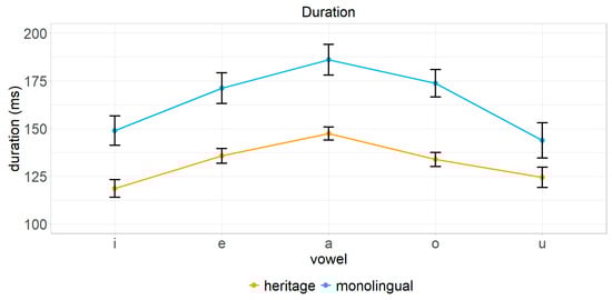 As shown in Figure 4 and Figure 5, Greek vowels were produced in a similar manner by both HSs and monolinguals. However, some differences occurred. The most considerable one pertained to /a/, which had a lower F1 (i.e., occupying a closer position) and a lower F2 (i.e., occupying a further back position) in HSs. In addition, vowel /u/ appeared to have lower F2 values in HSs. With respect to F3, /a o u/ seemed to have lower values in HSs. Furthermore, as seen in Figure 6, the duration of Greek vowels was lower in HSs compared to monolinguals. Hypothesis testing assessed whether the acoustic values of Greek vowels produced by HSs were lower compared to corresponding values produced by monolingual speakers. The results indicated strong evidence that Greek /e a o/ (ER = 15.74—inf, PP = 0.94–1) exhibited lower values for HSs compared to monolinguals in terms of F1. Furthermore, there was strong evidence that Greek /i a u/ were produced with lower F2 values by HSs (ER = 12.61–75.92, PP = 0.93–0.94). In terms of F3, strong evidence was found that Greek /o u/ demonstrated lower values in HSs (ER = 21.86–55.34, PP = 0.96–0.98). Moreover, there was strong evidence that the duration of all Greek vowels produced by HSs was lower compared to monolinguals (ER = 15.33–570.43, PP = 0.94–1.00). The results of the main analysis and the hypothesis testing are presented in Table 2 and Table 3, respectively.