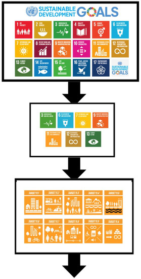 The next phase of the process establishes the differentiation concerning the goals indicated above under objective number 11. To this end, once the sources have been identified, variables are included that most represent the following phenomena and fields. These phenomena affected by variables are linked to the objectives described above under SDG 11. The phenomena captured are those that are in line with, among others, what is indicated by Neumann et al. (2015) [36] and Bosch et al. (2017) [37], considering the efficient work on the available resources of Smart Cities, which include but are not limited to: