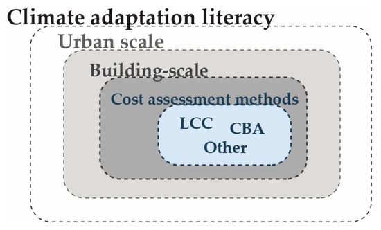 To situate the scope of this systematic review, Figure 1 illustrates the conceptual boundaries of the literature analysed. Climate adaptation research spans different scales, from urban and territorial strategies to individual buildings. This review narrows this wide field to the building scale and, within this subset, concentrates on studies applying cost assessment methods. Specifically, the analysis targets applications of CBA, LCC, and related economic approaches. This framing highlights both the breadth of the overall adaptation literature and the precise niche addressed by the present study.