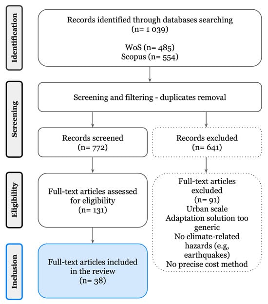 This left 131 articles for full-text review. During this phase, studies were excluded if they did not apply a cost-based method (e.g., CBA, LCC, etc.), if adaptation was not the main subject, or if the methodological description lacked sufficient rigour for systematic analysis. In addition, seismic risk studies were excluded, as earthquakes are not classified as climate-related hazards under the EU Taxonomy (Appendix A) [].