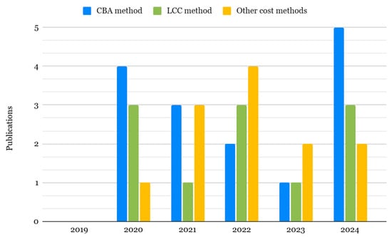 Based on the systematic review of 38 filtered records, targeted analyses were conducted focusing on the building typologies and scales of adaptation measures in relation to the specific hazards addressed, as well as on the economic methodologies applied. In particular, three main clusters of cost assessment methodologies used on building climate adaptation solutions were identified, as presented in Figure 3: (i) cost–benefit analysis (CBA) methods (15 publications), (ii) life-cycle cost (LCC) methods (11 publications), and (iii) other cost assessment methods (12 publications). The first cluster includes studies applying CBA to evaluate the effectiveness of building adaptation measures in relation to specific hazards. The second cluster encompasses research employing LCC approaches to determine the costs associated with specific adaptation interventions during the whole building lifespan. The third cluster comprises studies utilising alternative cost analysis approaches that, while differing from CBA and LCC, still offer valuable insights for the field. An analysis of the annual distribution of the reviewed publications (Figure 3) reveals that studies employing the CBA method (Cluster 1, blue columns) show an overall upward trend, with the highest frequency in 2024 (n = 5). In contrast, studies using the LCC method (Cluster 2, green columns) appear consistently yet with lower frequency. Publications utilising other cost methods (Cluster 3, yellow columns) demonstrate a gradual increase, particularly in 2021 and 2022, indicating a broadening methodological landscape in the economic evaluation of building-related adaptation interventions. It is noteworthy that no publications meeting the inclusion criteria were identified for the year 2019. This gap may reflect the relatively recent emergence of climate adaptation in buildings as a distinct field of economic research, particularly in connection with cost assessment methodologies. The increased attention observed from 2020 onward likely coincides with the growing influence of global policy frameworks and rising awareness of climate-related risks, which have collectively stimulated methodological advancements and empirical applications in this domain. While CBA has been the most frequently applied method, its use has not followed a strictly upward trajectory; for example, a decline is visible between 2020 and 2023. Rather than reflecting methodological superiority, this variation indicates that the choice of method is highly context- and project-dependent. In parallel, recent studies show growing recognition of whole life cycle analyses, underlining the importance of assessing adaptation strategies beyond short-term financial costs.