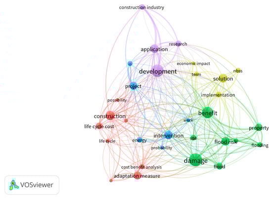 The analysis further highlights a robust cluster (green colour) on flood risk management and damage assessment, with keywords including damage, flood risk, property, and benefit, underscoring the importance of evaluating adaptation measures in terms of risk reduction and the protection of assets. Additionally, a cluster (yellow colour) related to the implementation of nature-based solutions (NbS) emerged, with terms such as solution, implementation, economic impact, and NbS, reflecting a growing focus on green adaptation strategies within the reviewed literature.