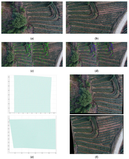 Image mosaic technology has been widely studied in many fields to stitch the images together. It includes image registration and image fusion. The image registration results affect the image fusion. With the diversity of the actual scenes, it is difficult to design a registration algorithm suitable for all scenes. To date, image registration includes frequency-based image registration and space-based image registration. Frequency-based image registration uses the Fourier transform to transform the image to the frequency domain for related processing. The typical frequency-based image registration is the Fourier–Mellin transform [7], phase correlation method [8] and the extended phase correlation method [9]. According to the research, it is known that frequency-based image registration methods can overcome the brightness difference and anti-noise and it is fast and efficient. However, it requires a large overlap ratio between two images, which is mainly applied to the horizontal transformation [10,11]. Therefore, the use of this method in a tea garden is greatly limited. The space-based image registration method is based on gray level or images features. The former divides the overlapping areas of one image into multiple sub areas and calculates their similarity of pixel values using a certain similarity criterion to obtain the translation. The principle of this algorithm is simple. Meanwhile, the registration effect of rigid transformation is good. However, it is greatly affected by illumination and noise, resulting in a large number of calculations [12]. To date, image registration based on features is the most widely used [12,13]. The features generally include feature points, straight lines, edges, and contours. This kind of registration algorithm extracts and matches the corresponding feature points of two images. Then, it calculates the transformation model between the two images to complete the registration.