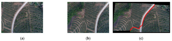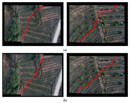 As shown in the above figures, the bold, red, solid lines are used to display the sutures searched. The image suture line refers to the line of pixels that are most similar to each other in the overlapping area of mosaic images. The two sides of the line are taken from the content of two images, respectively. The suture strategy greatly reduces the overlap area, which in turn alleviates the problems of blurring and ghosting. The higher the quality of the obtained suture, the more natural the transition of the two images on both sides of the line. Most sutures searched based on the color, texture, or traditional energy function [34,35] combine color and texture and cross the walking spaces of the tea tree area. They increased the probability of misplaced truncation. The algorithm used in this study first searches along the road between the tea trees, reducing the number of tea trees passing through, ensuring the continuity and integrity of the tea trees as much as possible, which conforms to human visual perception and facilitates subsequent agricultural analysis.