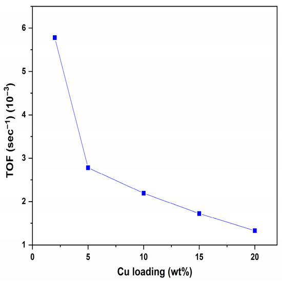 To determine the relation between catalytic activity and copper loading, the turnover frequency (TOF) values were calculated and are reported in Table 2. The number of Cu active sites was determined by a N2O decomposition method []. The TOFs were calculated from N2O decomposition data as the number of molecules of LA converted by one surface copper atom per second. The TOF calculation gives insight into the efficiency of a catalyst and allows for the comparison of different catalysts with varying active site densities. It is an essential parameter for understanding catalytic kinetics and optimizing reaction conditions in heterogeneous catalysis. Figure 1, which presents the relationship between turnover frequency (TOF) and copper loading, illustrates the connection between copper dispersion and hydrogenation activity. Conversion of LA decreases as the copper loading increases up to 20 wt% due to the formation of CuO crystallites on the surface of the SiO2 support. The decline in GVL selectivity, as shown in Table 2, may be attributed to the lower dispersion and larger particle size of copper, which is evident from the N2O decomposition and XRD studies. The results reported in Table 2 demonstrate a strong correlation between the data from N2O decomposition and the activity of the catalyst.