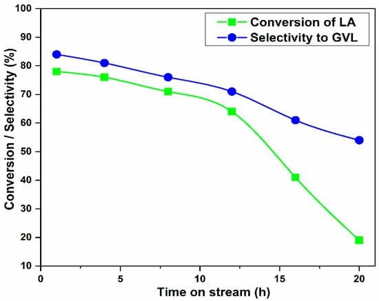 Catalyst stability is crucial to maintaining consistent catalytic activity throughout the reaction. Catalyst deactivation or degradation can lead to decreased conversion and selectivity. Various factors can influence catalyst stability, including the nature of the catalyst, reaction conditions, presence of impurities, and catalyst preparation methods. To examine the effect of time on stream (TOS) on the conversion of LA and selectivity of GVL, the study observed the 5 wt% Cu/SiO2 at 265 °C for 20 h, with findings displayed in Figure 4. The conversion of LA remained stable for up to 8 h on stream before sharply decreasing to 19% at TOS-20 h. The catalyst’s decrease in hydrogenation activity can be attributed to its deactivation, which happens when the Cu metal particles clump together and coke forms in the active sites. As a consequence, the surface area of the metal reduces, and the number of active sites decreases.