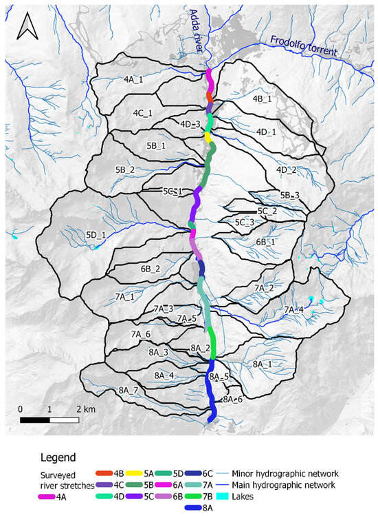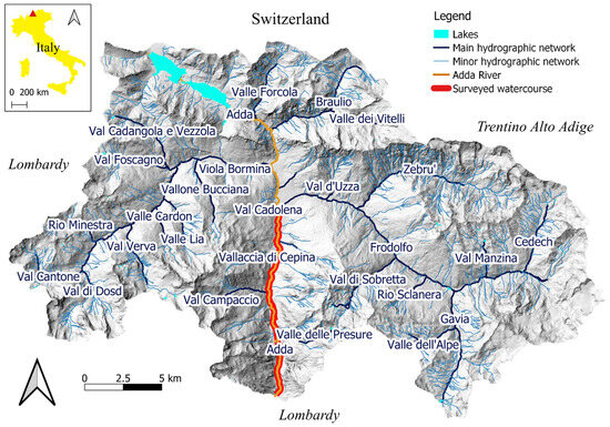 The case study is approximately 12 km of the Adda River (Figure 1) flowing north to south, from the municipality of Bormio to the village of Le Prese in Sondalo, located in the Upper Valtellina (Lombardy, North Italy). The enclosing perimeter of the surveyed watercourse encompasses a catchment of about 563 km2 with a range of altitude from 946 to 3829 m asl. The catchment area is predominantly covered by periglacial landforms (41%) with scarce presence of vegetation, forests (22%) and pasture (13%), while urbanized areas (1%) are concentrated along the main watercourse. The forests are mainly conifers, detailed as follows: Norway spruce (34%) and European larch (40%) are the dominant species, whereas mountain pine (17%) is the secondary species. The glaciers and perennial snowpack covered approximately 21.6 km2, concentrated in the Forni glacier in the western part. The lithology of the study area is homogeneous, with Leptosols and Podzols over the hillslopes, and Cambisols along the valley bottom.