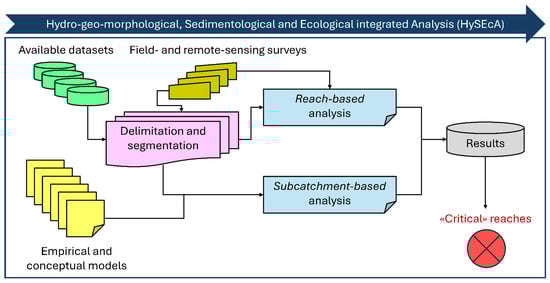 Hydro–geo-morphological, sedimentological and ecological integrated analysis (HySEcA, hereafter) is the proposed methodology for providing an overall characterization of the watercourse and its catchment, based on the assessment of the hydrological and sedimentological processes occurring on the hillslopes and along the river network. HySEcA is subdivided into the following three phases (Figure 2): (i) the segmentation of river network and the delineation of the tributaries and subcatchments, (ii) the completion of the available data through specific activities of field campaign, and (iii) the application of qualitative and quantitative approaches to estimate the watercourse dynamics and the magnitude of ordinary and extreme events that can potentially occur, associated with the sediment transport into the river network.