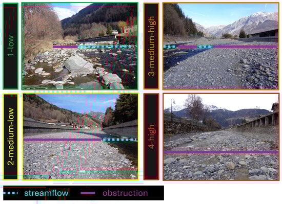 The torrent control structures play a significant role in controlling sediment transport []. Monitoring their functionality is essential and can be exclusively conducted through the first-level inspections, as described in Cislaghi et al. (2024) []. The first-level inspection is a meticulous scrutiny of the overall structure that allows us to assess the performance or, better, the loss of functionality, of the existing torrent control structures using a qualitative indicator. This metric is the Loss of Functionality Index (LoFI), ranging from 1 low (unaltered functionality) to 4 high (no residual functionality). The causes of deteriorated functionality can be detailed as (i) sediment deposition that can modify the streamflow concentration and can alter energy dissipation; (ii) the deposition of coarse or large wood materials that can obstruct the cross-section or can deviate the streamflow only on a side of the channel; (iii) erosion of the foundations or a specific side of the torrent control structures; and (iv) the uncontrolled colonization of riparian vegetation around and over the structure that can increase flow resistance, hydraulic roughness, and hydraulic depth, as well as reducing hydraulic velocity and impeding the adjusted (or “designed”) direction of streamflow. In the present study, the inspectors focused on the first case, assessing the LoFI according to the obstruction due to the sediment deposition (Figure 3).