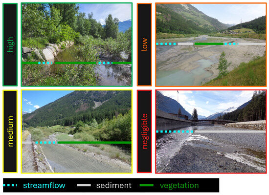 Monitoring the vegetation dynamics of the riparian and in-channel colonization is extremely important. The procedure consisted of observing and mapping the riparian vegetation patches over bars, islands, and banks, identifying the dominant species, and identifying their forest management approach, as conducted by Fogliata et al. (2021) []. Then, the riparian vegetation community was classified according to its density (negligible, low, medium, or high), as shown in Figure 4.