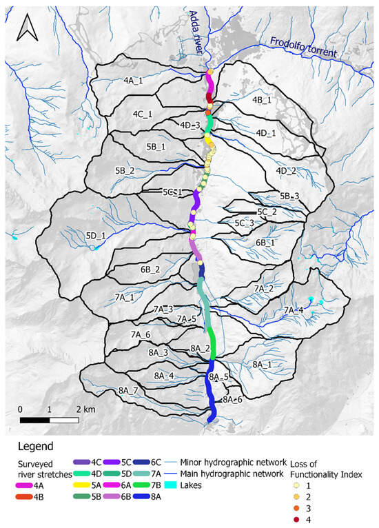 The diagnostic approach, including the integrated procedure HySEcA, provided qualitative and quantitative results that described the present conditions of the reaches (sediment, torrent control structures), and predicted the potential mobilized materials (water, sediment, and wood), a source of potential alterations along the watercourse. In the present study, the most evident morphological process was the estimation of high sediment production from the tributaries, and the aggradation of the gravel streambed. The deposition of gravel materials and the presence of several transverse torrent control structures that alter the slope of the streambed increased the level of flood risk and limited the watercourse dynamics. In addition to an overall assessment of the surveyed watercourse, the HySEcA included a more detailed assessment at reach scale. Such results can be simplified through discrete metrics (low, medium, and high) that evaluate the impacts of the main processes on the flood hazard (Table 7) inflow from the tributaries, erosion/deposition, and presence of obstacles. The upstream reach (4A), in proximity of the confluence between Adda River and Frodolfo Torrent, was identified as the most critical stretch of the watercourse, due to the observed significant aggradation of the streambed, the high input of sediment and large wood materials from the tributaries, and the limited sediment transport capacity. Other critical reaches were 4C, 4D and 6B, which showed an excess of deposited materials inside the channel and a relevant presence of obstacles.