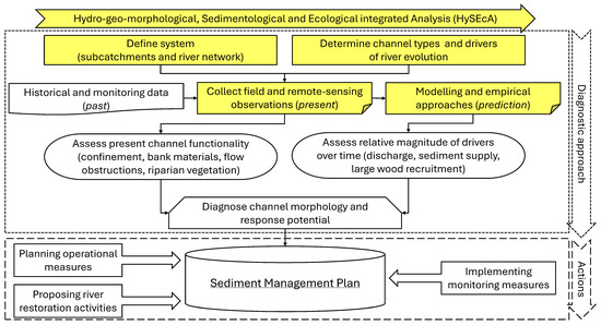 The integrated approach of HySEcA can be included in a more general diagnostic approach, drafting the SMP (Figure 7). As proposed by Montgomery and MacDonald (2002) [], the diagnosis for a watercourse is a careful examination of the hydrological, morphological and sedimentological features, to attempt to understand the river processes and to predict the river dynamics. The diagnosis assesses the channel conditions through the present and past observations, and forecasts the potential future channel condition, through (i) the definition of the system (reaches and subcatchments) and of the drivers influencing the river dynamics; and (ii) the application of models and empirical approaches in terms of qualitative and quantitative outcomes. HySEcA can partially cover the first two steps that can be completed by collecting historical data and by investigating the landscape and the land cover evolution of the surrounding area.