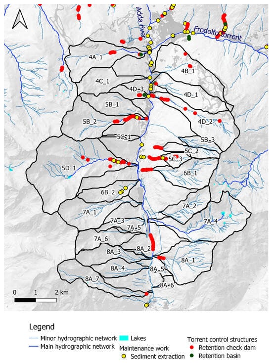 For this reason, sediment management (SM)—which represents one of the human strategies for conserving, preserving, and restoring the river environment, and for undertaking countermeasures to mitigate the flood risk—remains an arduous challenge. SM attracts more stakeholders, such as (i) regional and local authorities that control waterways, torrent control structures, the mining of materials, fisheries, etc.; (ii) researchers that investigate the torrent dynamics over the time; (iii) sediment miners that legally exploit the economy of the sediment as building materials; (iv) the policy makers that must regulate and comply with regulations of supranational organizations; and (v) the citizens that who live or own private properties in proximity of the watercourse. Despite or precisely because of this, SM is generally fragmented [] and is rarely based upon scientific knowledge []. In this context, SM must be an essential human activity focused on controlling the entire sediment cycle at catchment scale and not only a unit of sediment at a time, and must integrate various different goals to be more shared and maintainable as possible []. Thus, a different approach is desirable and must begin from drafting a modern and sustainable sediment management plan (SMP), incorporating knowledge (past and present), scientific advances (prediction), multidisciplinary actions, and the ability to propose different scenarios of intervention at catchment scale. In addition, SMP avoids the error of focusing on the hydraulic aspect, favoring the construction of transverse and longitudinal torrent control structures and the massive extraction of sediment from the streambed [,], worsening the morphological quality []. Thus, the present study aims to propose a generalizable procedure for identifying and prioritizing ordinary and extraordinary maintenance interventions through the scientific investigation of the elements constituting the watercourse (sediment, vegetation, streamflow and existing torrent control structures) and through leveraging the set of information and analyses already present in the databases of local, regional, and national authorities. Such an approach would have the advantage of reducing the time of the technical decision-making process, allocating funds to address specific deficiencies in the diagnostic framework, conducting additional monitoring activities, and/or increasing the necessary interventions.