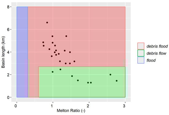 All these additional observations strongly agreed with the outcomes of the HySEcA procedure. For example, the construction of many retention check dams underlines that the river network of the subcatchments are prone to debris flood and especially to debris flows with a high sediment transport. This evidence was confirmed by examining the catchment predisposition in terms of sediment supply through the simplest method of Wilford et al. (2004) [], drafting a scattergram using MR and basin length (i.e., the planimetric straight-line length from the fan apex to the most distant point within the subcatchment) with class limits for the hydrogeomorphic processes such as flood, debris flood, and debris flow.