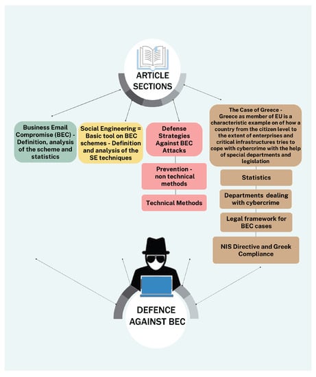 Mitigating the threat of Business Email Compromise (BEC) attacks requires ongoing efforts from organizations and individuals. Attackers constantly evolve their tactics, employing sophisticated phishing techniques, social engineering, and email spoofing to deceive victims. To effectively counter these attacks, cybersecurity awareness and comprehensive defense strategies are essential. In our study, we aimed to provide insights into BEC attacks, delving into the complexity of the scheme and the social engineering techniques that are employed. We also aimed to offer practical guidance for individuals and companies to protect themselves against BEC attacks, and we informed them about the actions needed after a BEC attack to minimize the consequences of the scheme and to facilitate the work of the authorities. By exploring social engineering tactics, we aimed to enhance the understanding of psychological manipulation techniques used by attackers, empowering individuals and organizations to recognize and respond effectively to BEC attacks. Proactive defense measures were proposed to mitigate the risk of falling victim to deceptive schemes. In addition, we performed an extensive analysis of Greece, chosen as a representative case within the European Union, to illustrate its efforts in combating cybercrime through legislative measures and the involvement of relevant departments and authorities. The significance of a country’s legislation and defense strategies against cybercrime extends beyond its own borders, as they directly impact the security of individuals and enterprises operating within its jurisdiction. Overall, the contribution of this study is that it provides all the necessary information about BEC schemes in coordination with the existing European legislation. The study also suggests various measures for preventing and countering BEC schemes, and it also recommends actions needed to be taken after the attack takes place. Legislation is a critical factor that is often overlooked and contributes not only to defining the general concept (such as penalties and fines) of illegal actions, but in this case, regarding cybercrime, enforces various technical and non-technical measurements in order for individuals, enterprises and critical infrastructures to be efficiently protected. Figure 2 exhibits the main sections of the article and aims to inform the reader about BEC attacks and how to counter them.