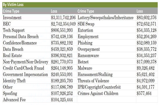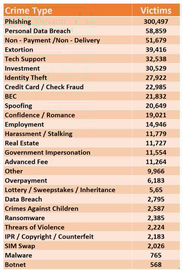 - FBI. Internet Crime Report. 2022. Available online: https://www.ic3.gov/Media/PDF/AnnualReport/2022IC3Report.pdf (accessed on 25 April 2023).