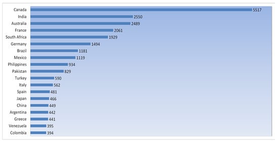 Chart of the top 20 countries by number of total victims as compared to the United States for 2022. The specific number of victims for each country are listed in ascending order to the right of the graph [].