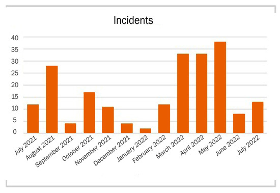The European Union Agency for Cybersecurity (ENISA) also reports that BEC is one of the most impactful types of cybercrime. Compared to previous years, the median transaction size for Business Email Compromise attacks further increased substantially, despite the efforts of law enforcement agencies to suppress this tension []. Figure 6 shows a chart with a time series of major incidents observed by ENISA (July 2021–June 2022) concerning social engineering threats.