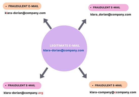 - Business Email Compromise Phishing: This term refers to scams that usually involve the compromise of legitimate business email accounts in order to deceive the victim to conduct unauthorized transfers of funds, giving confidential information [,], and in some cases, installing malware (such as keyloggers). An attacker often uses an address that may differ from that of the attacked organization by just one or two letters. For example, a scammer can replace a lowercase L (“l”) with a capital I (“I”), making it extremely difficult to distinguish with the naked eye [] (Figure 8).