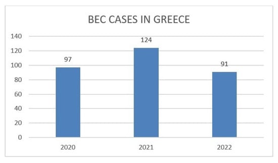 According to the FBI’s 2022 report [] BEC is one of the fastest growing, most financially damaging internet-enabled crimes, and is a major threat to the global economy. The sophistication of BEC criminal actors and their ever-evolving tactics has increased over time, likely driving increased dollar losses. BEC actors have targeted large and small companies in every U.S. state and more than 150 countries around the world. As IC3 mentions [] in its 2022 crime report, the agency reports 21,832 Business Email Compromise (BEC)/Email Account Compromise (EAC) victims, with adjusted losses at nearly USD 2.7 billion. Figure 3 shows a chart from IC3 with the numbers of victims for various crime types for 2022, Figure 4 shows an estimation of victim losses categorized by crime type for 2022, and Figure 5 shows Greece’s place in a chart with the top 20 countries by number of total victims as compared to the United States for 2022.