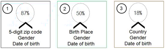 Recently, personal data have become an economically desirable resource, and they offer valuable knowledge that can influence science and advance societies. Personal data can be used to improve real-world data-driven services such as improved and low-cost healthcare, better recommendations by utilizing heterogeneous data, and increase the precision of navigation information. However, personal data often encompass sensitive information and require privacy preservation in processing and dissemination []. According to a survey [], user privacy can be compromised by using different attributes present in the data even if some unique information is removed from the data. The survey findings are summarized in Figure 1, where three combinations of attributes have a distinct impact on users’ re-identification in a dataset.