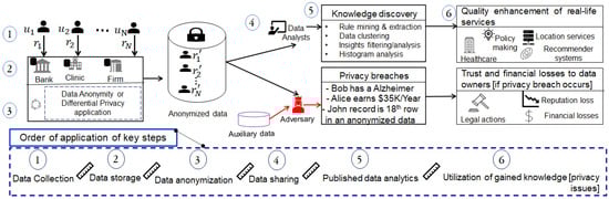The whole PPDP process encompasses five key steps. In the first step, the data are collected from the relevant people. The collected data can be of any type such as demographics, information about monthly earnings, disease contracted, etc. In the second step, the data are stored, and pre-processed (the pre-processing includes data cleaning and quality enhancement (removing redundant records, removing outliers, handling missing values, and giving simplified structure to the data)) in the data owners’ environments. The data owners can be hospitals, banks, insurance companies, social network service providers, etc. Later, the data are anonymized with the help of generalization hierarchies or the noise addition of DP. In the fourth step, the data are outsourced to data analysts or miners to extract the enclosed knowledge. The data are published either directly by the data owners or with the help of third parties. In the fifth step, the published data are analyzed by analysts or data miners with the help of advanced data mining or machine learning tools. In the last step, the knowledge gained from the published data is used to improve real-world services such as healthcare, smart cities, recommendation systems, navigation services, and other data-driven services [,]. Data sharing has become a routine matter amid the rapid rise in digital developments. In addition, data sharing is imperative to improve the quality of data-driven applications/services in the modern era.