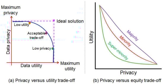 Although a substantial number of studies were proposed to address privacy issues in PPDP, there are still two major trade-offs that are hard to achieve. We present both trade-offs in Figure 3. In the first trade-off, the semantics of the original data need to be preserved []. In contrast, for the second trade-off, it is desirable to prevent minor values from dilution during the anonymization []. Despite many developments, both these trade-offs are quite challenging to achieve in the PPDP scenarios. The effective resolution of the privacy–utility trade-off is hard to achieve owing to strict privacy parameters to be applied during anonymization, poor quality of the underlying data, strict privacy/utility guarantees, and lack of evaluation metrics. In some cases, the selection of the optimal level/ to perform data generalization/transformation leads to the solution of one metric, i.e., either utility or privacy []. Similarly, the privacy–equity trade-off cannot be achieved owing to the poor quality (e.g., data imbalance) of the original data. For example, if there are fewer representations of some minor groups in the real data, the anonymization method further reduces the representation, leading to fewer benefits for some minority groups. Most anonymization methods do not improve data quality before anonymization, and therefore, it is very hard to achieve the trade-off between privacy and equity. In the modern era, it was suggested to improve data quality to lower the data-driven threats []. In conclusion, there are many obvious reasons (e.g., poor data quality, inappropriate anonymization, data owner requirement, privacy and utility objectives, data publishing goals, wrong data collection processes, and malicious entities present in the PPDP process) that make these trade-offs hard to achieve. All three trade-offs interact with each other because the data portion, which contains more information for analytics/mining, may require better privacy preservation. However, the data owners can make choices regarding these trade-offs to be resolved depending upon the goals of data outsourcing. It is worth noting that the quantification of these trade-offs depends on evaluation metrics, and therefore, the selection of optimal metrics is desirable to quantify them accurately in various applications.