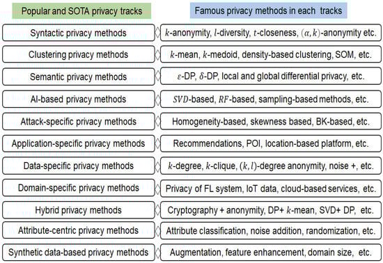 A variety of techniques were developed to safeguard user privacy in personal data handling. To this end, famous solutions are encryption, masking, watermarking, secret sharing, secure multiparty computation, anonymization, and secure enclaves [,]. Despite other solutions, anonymization is one of the most widely used tools for preserving the privacy of user data owing to the least computing complexity, the ease in employment, and the conceptual simplicity. Anonymization technology has significantly advanced from multiple perspectives, and many independent tracks exist thus far. Figure 4 systematically presents the advancements in the privacy domain. The anonymization concept started with the syntactic privacy methods and advanced to many other latest methods, as shown in Figure 4. For example, the syntactic methods yielded poor utility and were improved by the clustering-based methods. The DP-based methods have shown remarkable achievements in static and dynamic scenarios. For example, DP-based methods were implemented widely in different domains such as federated learning, IoT, industrial IoT, and cloud computing environments for privacy preservation. Many AI-based methods were also used to improve many critical parts of the traditional anonymity methods and to improve the privacy and utility results []. Some methods were developed to counter a specific privacy threat or to preserve privacy in a specific data style (i.e., table, graph, matrix, text, trace, etc.). In some cases, more than one method was jointly used to protect the privacy of user data. To the best of our knowledge, detailed tracks and famous methods under each track, in particular, attribute-centric anonymization and synthetic-data-based methods, have not been discussed in previous studies.