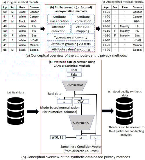 Referring to Figure 6a, the detailed information concerning the composition of the data is exploited to ease the anonymity process. For example, by classifying data and exploiting the co-relations between attributes, privacy and utility can be effectively preserved []. By exploiting information concerning data, computing power can also be saved, and only the relevant parts can be anonymized []. Referring to Figure 6a, the conditional generative adversarial (CTGAN) model is employed to create synthetic data by mimicking the properties of real data. In the CTGAN model, the important component is the conditional vector that guarantees the data generation of the best quality. Recently, many variants of GAN models were developed to curate data of diverse modalities (e.g., time series, images, tabular data, graphs, etc.) for different use cases [,,]. Both these methods are very recent and significantly contribute to data outsourcing while preserving data privacy. In recent years, many privacy-preserving methods were developed to securely publish personal data. Hongbin et al. [] proposed a multidimensional data aggregation and privacy-preserving scheme based on the federated learning concept. The proposed scheme can be used in industrial IoT domains to restrict privacy breaches. Paul et al. [] discussed the security and privacy concerns in the healthcare sector due to the rapid rise in digital technologies. Muneeswari et al. [] developed a privacy-preserving framework for self-diagnosis based on IoT devices. The proposed framework utilizes patient records and performs analysis without losing guarantees of privacy. Xie et al. [] proposed a blockchain-based framework for privacy preservation in IoT scenarios. Liu et al. [] proposed a novel method by amalgamating machine learning techniques and conditional probability distributions to effectively resolve the privacy–utility trade-off. The proposed method can be used to preserve privacy in single as well as multiple SA scenarios. Hewage et al. [] discussed the PPDSM and PPDM methods used for privacy protection. The authors analyzed the strengths and weaknesses of the existing methods and stressed the need for more methods in the PPDSM domain in the future. Terziyan et al. [] proposed a method for privacy preservation in the image data. The authors used privacy protection methods with (convolutional, variational) autoencoders to preserve the privacy of the image data. Qin et al. [] developed a scheme to trace virus-infected people without exposing their privacy. The authors proposed a new IoT data management architecture and applied various perturbation techniques to effectively preserve privacy and availability in the cloud environments. Kumuthini et al. [] proposed two methods (i.e., archive and data commons) for genomics data sharing. The authors highlighted the challenges involved in data sharing and discussed privacy and security concerns. Yang et al. [] proposed a method for privacy preservation in query execution. The proposed method protects the exposure of personal information in query-based systems and answers queries without breaching the confidentiality of the underlying data. Table 1 presents the summary and comparisons of the above-cited SOTA approaches from a broader perspective.