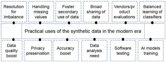 Recently, synthetic data have been widely used to preserve the privacy of users while fulfilling the data analytics needs [,]. In recent years, a large amount of data has been needed to train AI models for enhancing accuracy, particularly in the healthcare domain []. To this end, synthetic data can be employed to increase the number of samples in training data. Synthetic data have become a SOTA technology with a wide range of practical applications in diverse sectors. Figure 7 presents the practical uses of synthetic data in the modern era. From Figure 7, it can be seen that synthetic data are widely used as a replacement for real data in diverse sectors. The application of synthetic data in the healthcare sector is also steadily increasing with time []. Figueira et al. [] recently presented a comprehensive survey on different tools that can be used to generate synthetic data (in a tabular form), particularly generative adversarial network (GAN) architectures. Gonzales et al. [] recently discussed the innovative uses of synthetic data in healthcare. Based on these major developments, it is fair to say that synthetic data are one of the leading technologies of the future. This paper focuses on privacy preservation, and therefore, we demonstrate synthetic-data-based privacy methods. This topic has attracted the researchers’ attention in recent years, and many notable developments have been made [].