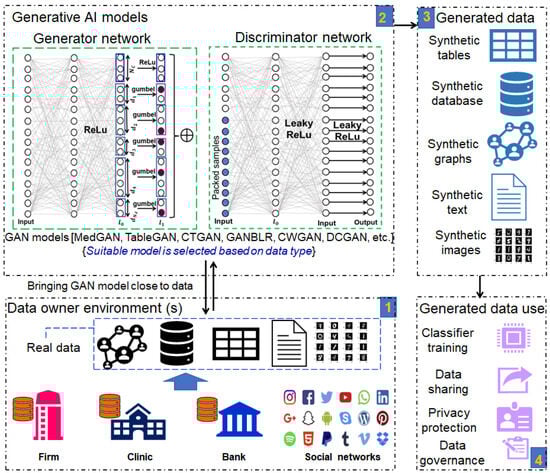 Recently, synthetic data (SD) have become an indispensable component for AI applications, and therefore, many generative models were recently developed to compensate for the deficiency in good data [,]. The SD generated with the generative models has lots of applications in diverse fields such as medical image analysis, fault diagnosis, language models, image recognition, and medical diagnosis, to name a few. Furthermore, some companies are sharing SD rather than real data to overcome privacy concerns. Figure 8 presents SD-based developments along with the experimental details. We classify the SD generation process into four key steps, as marked in by the color yellow. As shown in Figure 8, the real data are mostly limited to the data owners’ environments, and therefore, generative models of a suitable type can be moved closed to that data to produce synthetic data. The structure of each generative model is different, and therefore, a suitable model is chosen based on the data type. For instance, to generate tabular data, Table-GAN can be used. In contrast, DCGAN is suitable for generating synthetic images. Similarly, for the time-series data, a different GAN model can be used. After training GAN models by connecting with real data, the SD can be obtained in diverse formats depending upon the application. Later, the SD can be used for different purposes, as shown in Figure 8(4). In recent years, SD has been widely used for data augmentation purposes while building classifiers. With the advent of the DC-AI concept, SD has become an enabling technology for AI applications. In the coming years, SD will be used as an integral component for medical applications, where access to real data is often prohibited owing to privacy concerns.
