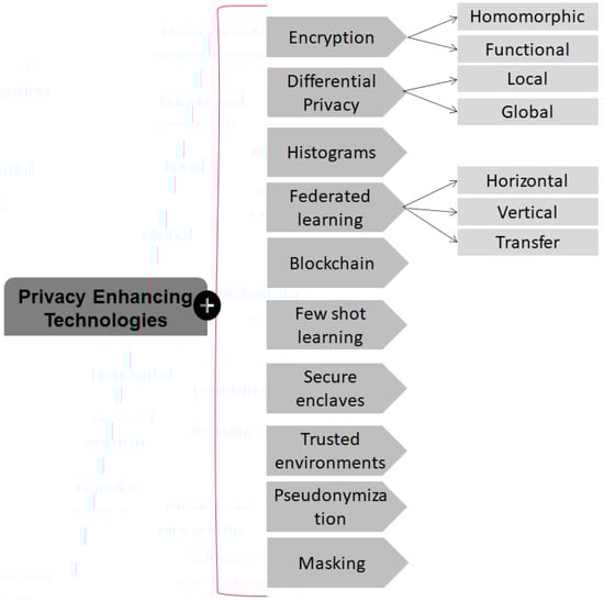 Referring to Figure 9, encryption is widely used in dynamic environments (e.g., cloud computing) to prevent personal data from disclosure []. Recently, encryption techniques were amalgamated with AI techniques to preserve the privacy of personal data []. DP is widely used to preserve the privacy of data while permitting the analytics of data. It has become one of the famous PETs of modern times and is widely used in federated learning environments to preserve the privacy of data/parameters [,]. When privacy requirements are very high, only some statistics in the form of histograms are shared with the data analysts [,]. Federated learning is one of the modern PETs that does not aggregate personal data in central environments but allows AI model training. FL has become a SOTA solution for privacy preservation when data is located in various places [,]. Blockchain is another famous PET that can protect the privacy of the data as well as of participants. Blockchain is widely used to share data with multiple parties while preventing privacy breaches [,]. Few short learning is a famous PET for training large AI models with limited data, leading to privacy preservation in AI applications [,]. Trusted environment and secure enclaves are hardware-based approaches to guarantee the privacy of user data [,,]. These approaches are becoming famous PETs due to the rapid rise in AI-based applications. Pseudonymization is a widely used technique for privacy preservation in cloud-based environments such as smart home environments, smart grids, and medical domains [,]. Finally, masking techniques are widely used to hide identity or sensitive information in a variety of data formats (e.g., images, videos, etc.) [,]. All of these technologies play a vital role in preserving individual privacy in static or dynamic environments. In some cases, hybrid PET is used to provide stronger privacy guarantees than individual techniques []. Recently, many PETs were also developed to provide privacy guarantees in epidemic handling systems that are being developed to fight the ongoing pandemic [,,,]. Apart from these developments, more secure PETs are required to provide privacy guarantees in personal data handling.