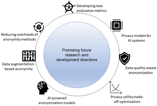 In this section, we present promising research and development directions for future work. Figure 10 presents the list of promising directions that require more work from the research and development point of view. For example, there is a serious lack of methods that can be applied to poor-quality data. In some cases, the data sensed from some devices such as sensors may contain errors, and therefore, applying anonymity to them directly may lead to the wrong data mining results. To this end, some new methods were developed to add noise to true values only, leading to lowering errors in histogram generation, as well as generic data mining results []. Some works have also explored the impact of data quality on privacy in real-time applications and crowdsensing scenarios []. Recently, some data-centric developments have been made to augment the performance of AI applications involving fewer data []. Hence, it is vital to adopt data-centric practices in the privacy domain to develop more secure methods (data quality-aware anonymization) in the future era. In the coming years, AI models will be applied to every sector, and therefore, it is imperative to devise secure methods for privacy preservation in AI systems []. To this end, amalgamating anonymization methods with AI systems is an attractive area of research for the near future. Privacy and utility optimization is a long-standing problem in the privacy domain []. Hence, it is vital to devise methods that can provide strict privacy guarantees without compromising usefulness in data-sharing scenarios.