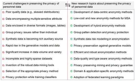Based on our recent work [], we found that AI models can improve some critical parts of the conventional anonymization methods. Therefore, it is vital to amalgamate the AI methods with the traditional anonymization methods to secure personal data effectively. In the coming years, hybrid anonymization methods may be needed to preserve the privacy of data enclosed in multiple formats. In the past, most anonymization methods anonymized data without improving their structure (e.g., without balancing the distributions), leading to poor data quality and poor privacy guarantees. In the future, it is vital to improve/augment data before its anonymization, particularly when the quality of the data is poor []. Data augmentation-based anonymization methods can improve the quality of the data, leading to better data mining and analytical results. In most anonymization methods, the computing complexity rises with either the horizontal or vertical expansion of data, and therefore, it is extremely important to reduce computing overheads when the underlying data to be anonymized are large [,]. In future endeavors, devising low-cost methods (e.g., least computing and space complexity) for diverse data styles (e.g., graphs, images, text, etc.) is a vibrant area of research. Finally, there is a lack of metrics that can correctly capture the level of privacy and utility []. Hence, it is imperative to devise formally verified evaluation metrics in future endeavors. Finally, there is an increasing focus on developing clustering-based anonymization to improve the shortcomings of traditional anonymization methods [,]. However, there are various critical problems with these methods such as poor convergence, a substantial number of iterations, and higher computing overheads. Hence, improving the technical status, applicability, and convergence criteria is a vibrant area of research for the future. Figure 11 provides a detailed overview of the current challenges in the privacy domain and new research topics about preserving the privacy of personnel data. Due to the rapid rise in personal data, privacy issues are becoming more evident [,]. Therefore, robust, efficient, and low-cost anonymization methods are necessary to preserve privacy in futuristic applications. The analysis discussed in Figure 11 provides a clear overview of the future research trajectories in preserving the privacy of personal data.