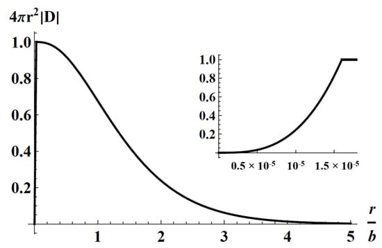 The value of the modulus of the electric displacement field plotted on the atomic scale for the hydrogen atom in the ground state. In order to interpret this plot as the total amount of charge enclosed within the sphere of radius r (Gauss law) is multiplied by . The details of the behavior of close to the center are shown in the inset on the scale of the proton radius. Starting from the origin, the enclosed charge increases as and reaches the value of 1 at the proton radius a.
