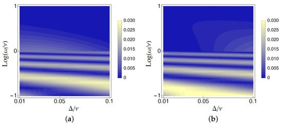 In Figure 3,  is shown as a function of  and  for two values of the detuning , in particular, for  (Figure 3a) and  (Figure 3b). One can see that the values of the quantity in a particular parameter region are much higher than in Figure 2, reaching the value of . These high values can be justified by the fact that increasing the value of  implies increasing the amplitude of the coupling term between the three-state system and the environment. In particular, a high value of  means dealing with a high value of  (and consequently all ), which in turn implies a higher value of .