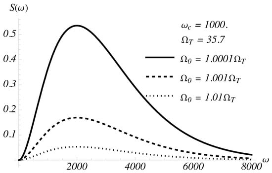 and this oscillation frequency, which appears in the Heisenberg equation of motion, must be positive []. In Figure 2, we plot the spectrum for the virtual photons. In neither of these cases is there a feature special to the frequency . This is a simple consequence of the dominant role played by antiresonant, excitation number non-conserving, transitions in the creation of virtual photons. One can see that both and increase as the frequency is reduced. One can understand this behaviour quite naturally by considering the modification of the bare ground states for the Lorentz atom and the field in lowest order perturbation theory. The corresponding correction to this, in which the atom goes into its first excited state by emitting a photon, depends on the frequency of the emitted virtual photon, and on through the factor . This modification, and the corresponding probability for the presence of a virtual photon, will increase as the frequency decreases.