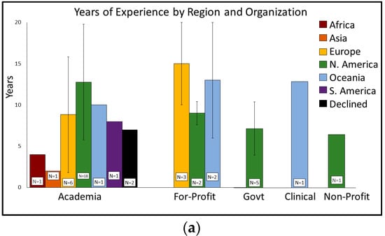Respondent demographics by years’ experience, region, and research: (a) Respondents’ years of experience (y-axis; mean ± standard deviation) plotted by organization (x-axis) and global region (legend). The number of respondents (N) per category is indicated by the white inset box. The percentage of respondents by (b) research focus and (c) research field are depicted in the pie charts.