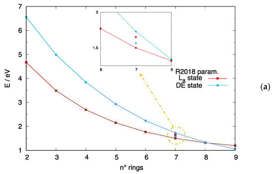 In contrast with the singly excited state, comparably fewer investigations have considered the prediction of the DE state of [n]-acenes, and in Figure 6a we collect the most relevant results taken from the literature, along with our computed results. In this case, little experimental data are available for [n]-acenes: for the smaller acenes, two-photon absorption (TPA) investigations [,] identified a low-lying state of Ag symmetry. Notably, while for []-acene the experimental data from TPA (black empty squares in Figure 6) are nicely reproduced by most calculations, for []-acene, the experimental excitation energy of the TPA active state is much lower compared to the predictions of the DE state. This can be reconciled in the light of our DFT/MRCI wavefunction analysis. These calculations show two low-lying excited states of Ag symmetry for naphthalene, the highest of which is the DE state while the lowest is only marginally affected by doubly excitations and its computed excitation energy (red isolated circle and square in Figure 6a, for the R2018 and original parametrizations, respectively) is in much better agreement with the experimental TPA data. On the computational side, apart from []-acene, the lowest Ag excited state is always the DE state for longer acenes. Overall, we note that DFT/MRCI calculations with both parametrizations are in very good agreement with the available experimental data [,,] and with the results of pp-RPA calculations []. SF-TDB3LYP excitation energies show an acceptable trend, with a slightly too-steep energy decrease with the acene length. NEVPT2 and MCCEPA [] appear to overestimate the excitation energy of the DE state for longer [n]-acenes. Finally, an unexpected excitation energy increase with the extension of the oligoacene is determined by TDUB3LYP calculations. Similar trends characterize the predictions of the DE state for [n]-CCs and, extrapolating from [n]-acenes, we can conclude that the quality of the DFT/MRCI results is expected to be comparable to the pp-RPA calculations also for the carbon nanobelts.
