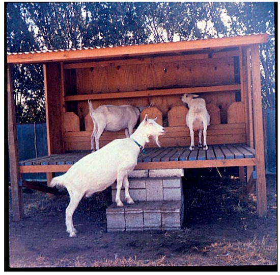 Of course, last not least, there are the dairy breeds of goats, especially the Swiss varieties of Saanen, Alpine, Toggenburg, Oberhasli, and those from other parts of the world like the Nubian from the United Kingdom (U.K.), the Jamnapari from India, the Manchego sheep from Spain, the LaMancha from USA, and the Dwarf goats from Nigeria. The dairy breeds have been the more prominent and, over the years, the most persistently profitable goats, as they provide meat, and principally milk, not only for a majority of people around the world, but locally, in greater quantities than is needed by a small household []. A real dairy industry has developed in the last 100 years transforming goat milk into sales on the gourmet and health-conscious market like in Europe and USA, and by mail-transforming goat milk into many artisanal cheeses of many varieties and ages, and also yogurt, butter and cosmetic soap products, and even feeding goat milk to calves for prime-meat-quality veal calves. In Saanen goat-milking, the portable converted cow-milking machines made it easy milking for a small dairy goat farm operation as well as even university students in Delaware, while the disposal of large amounts of milk was more of a challenge []. However, instead of making cheese, as many new US goat farmers today are doing, feeding most of the milk at the rate of as much as 15-L per day of fresh milk to each young Holstein bull calf proved to be a very profitable business, as the calves were easily gaining 2.5 kg bodyweight per day and were developing into prime meat class veal for sale [].