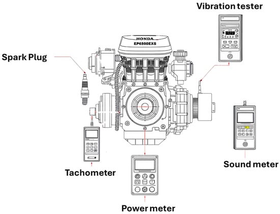 To evaluate a combustion engine’s performance, a precise experimental setup with accurate instruments is crucial for collecting reliable data. This study utilized a single-cylinder Honda air-cooled four-stroke engine (EP6500EXS), Kumamoto, Japan, connected to ten 10-kilowatt electrical heaters, as shown in Table 1. A digital energy analyzer monitored voltage, current, and power. The engine speed was measured by counting spark plug sparks and verified with a digital tachometer, as shown in Figure 1. During testing, the engine speed was controlled via a manual throttle lever, allowing us to fix the speed at desired RPM values (e.g., 1000, 2500, and 3600 RPM). While the governor helped stabilize speed within narrow limits under varying loads, the primary control mechanism was the throttle setting.