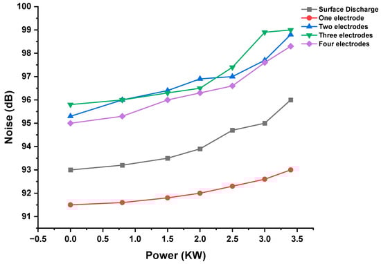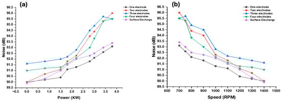 Engine noise rises with power output for all tested spark plugs and speeds. However, one- and four-electrode spark plugs produced less noise and exhibited more gradual increases in combustion efficiency than two- or three-electrode designs, suggesting that electrode configuration influences combustion efficiency. The “Surface Discharge” plug exhibited a distinct, sharper increase in noise at higher power levels, as shown in Figure 4. The non-linear noise-RPM relationship indicates that factors beyond engine speed, such as combustion efficiency and flame propagation, significantly contribute to noise. Overall, the electrode configuration significantly impacts engine noise across various power outputs [,]. Spark plugs with one electrode show a roughly 7% noise increase from the lowest to the highest power, while those with four electrodes exhibit a more moderate 6% increase. By contrast, two- and three-electrode spark plugs produce the highest noise levels, with 8% and 7.5% peak increases, respectively. The “Surface Discharge” spark plugs follow a unique pattern, characterized by lower noise at lower power settings but showing a much steeper increase, exceeding 10%, at higher power output. While the noise generally decreases with increased RPM—hence power reduction—this relationship is not linear, indicating that factors other than engine speed, such as combustion efficiency and flame propagation, also contribute to noise production.