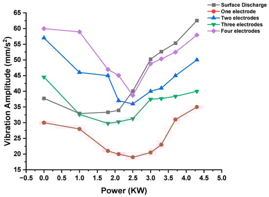 Figure 6 illustrates a clear trend of increasing engine vibration with higher power output behind specific points, regardless of the spark plug type. This confirms that more forceful combustion generates more significant vibration. Nonetheless, the specific kind of spark plug significantly affects the vibration’s amplitude. Compared to the “two-electrode” and “three-electrode” types, the “one-electrode” and “four-electrode” types exhibit less vibration over the whole power range, suggesting more stable combustion. The “Surface-discharge” spark plugs’ behavior indicates significantly different combustion characteristics, which exhibit slight vibration at low power and a sharp increase in vibration with power. It is interesting to note that vibration typically exhibits a non-linear relationship with increasing RPM, with engine speed having a negligible effect compared to the impact on flame propagation and combustion efficiency. Ultimately, the best spark plug configuration needs to be adjusted for the operating environment: “Surface Discharge” may work better at lower power. At the same time, “One-electrode” or “Four-electrode” is more appropriate for higher outputs. The findings emphasize how crucial it is to take spark plug design into account for better engine performance and fewer undesired vibrations.