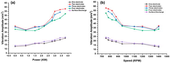 Effect of spark plug design on engine vibration. (a) Vibration amplitude as a function of engine power output for different spark plug configurations. (b) Vibration amplitude as a function of engine speed (RPM) for different spark plug configurations.