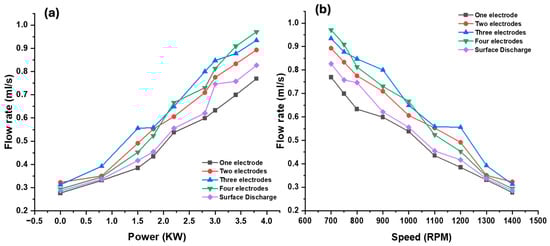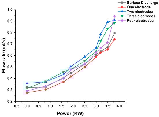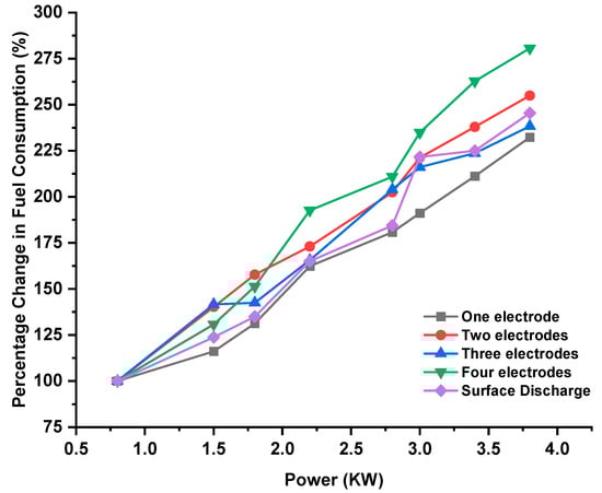 Figure 7 shows that increased electrodes correlate with higher fuel flow and power. While more power demands more fuel, the spark plug type affects consumption. One electrode typically used the least fuel (6.67–14.49% reduction), while four electrodes used the least at maximum power (30.37% decrease). Two electrodes consistently showed higher fuel flow. One electrode appears to be the most fuel-efficient overall, but four may be better for achieving peak power based on the flow rate. The “Three electrodes” configuration exhibited the steepest increase in fuel flow relative to power, indicating efficient fuel utilization. “Surface Discharge” showed the smallest increase, indicating less fuel consumption, likely due to combustion efficiency. Multiple electrodes can improve combustion, but they also increase fuel consumption. Further research is necessary to understand the relationship between electrode number, combustion, and fuel consumption.
